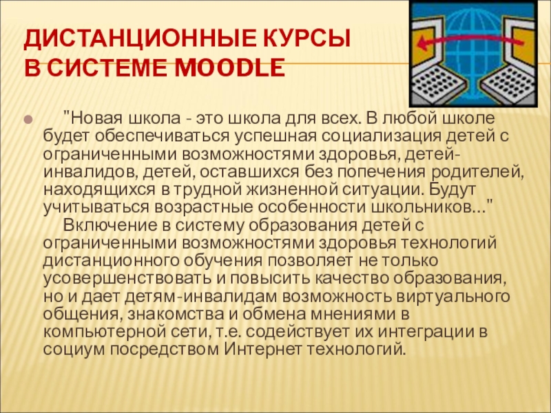 Включение в систему образования детей с ограниченными возможностями здоровья технологий дистанционного обучения позволяет не только усовершенствовать и повысить качество образования, но и дает детям-инвалидам возможность виртуального общения, знакомства и обмена мнениями в компьютерной сети, т.е. содействует их интеграции в социум посредством Интернет технологий.