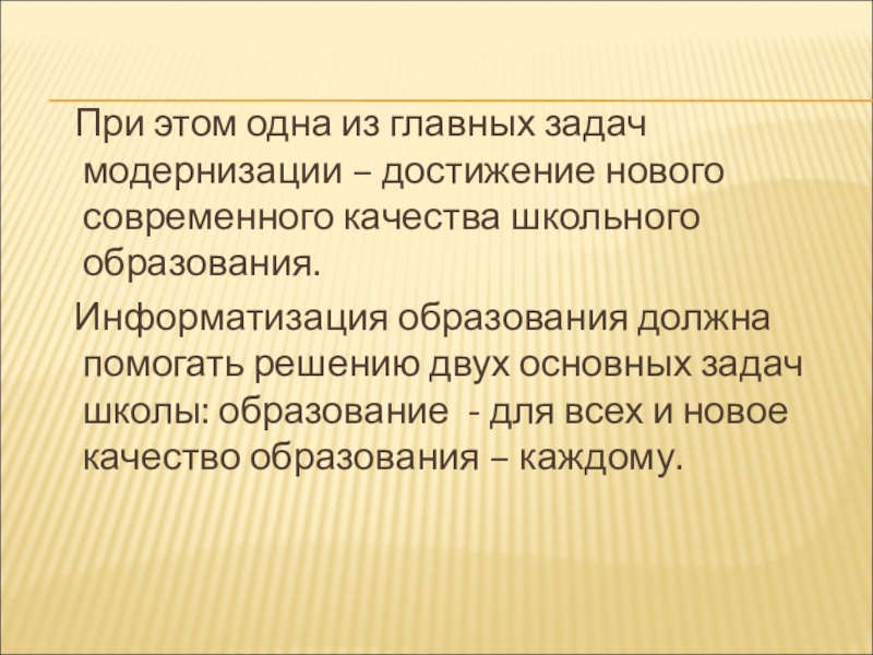 Информатизация образования должна помогать решению двух основных задач школы: образование - для всех и новое качество образования – каждому.