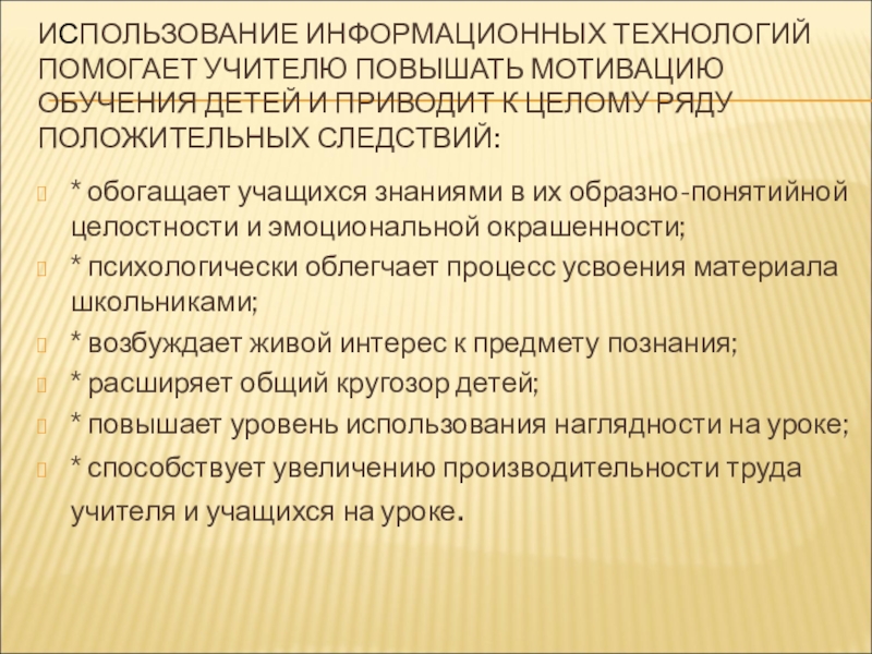 Слайд 44ИСПОЛЬЗОВАНИЕ ИНФОРМАЦИОННЫХ ТЕХНОЛОГИЙ ПОМОГАЕТ УЧИТЕЛЮ ПОВЫШАТЬ МОТИВАЦИЮ ОБУЧЕНИЯ ДЕТЕЙ И ПРИВОДИТ