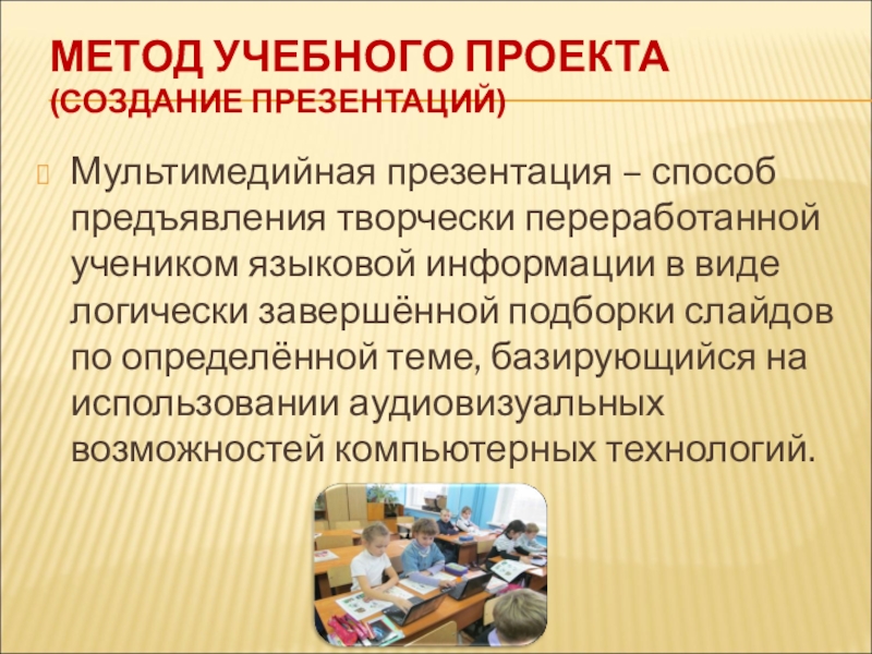 творчески переработанной учеником языковой информации в виде логически завершённой подборки слайдов по определённой теме, базирующийся на использовании аудиовизуальных возможностей компьютерных технологий.