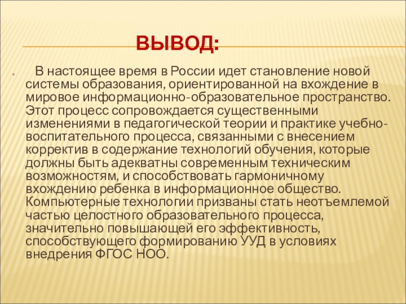 В настоящее время в России идет становление новой системы образования, ориентированной на вхождение в мировое информационно-образовательное пространство. Этот процесс сопровождается существенными изменениями в педагогической теории и практике учебно-воспитательного процесса, связанными с внесением корректив в содержание технологий обучения, которые должны быть адекватны современным техническим возможностям, и способствовать гармоничному вхождению ребенка в информационное общество. Компьютерные технологии призваны стать неотъемлемой частью целостного образовательного процесса, значительно повышающей его эффективность, способствующего формированию УУД в условиях внедрения ФГОС НОО.