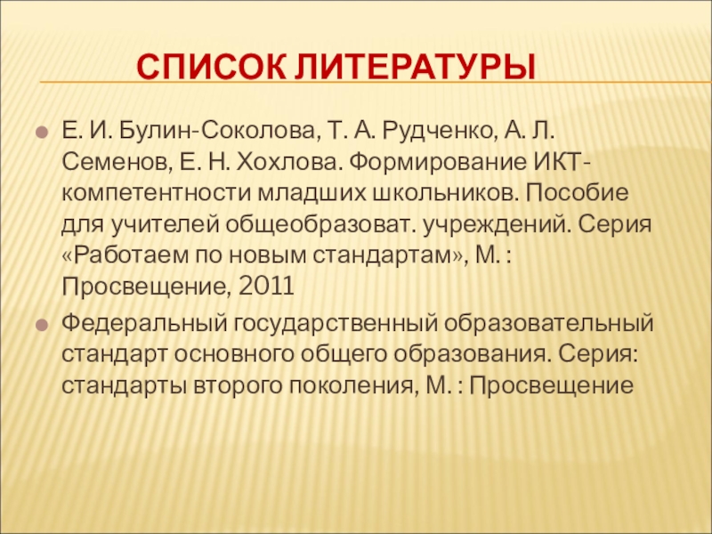 Булин-Соколова, Т. А. Рудченко, А. Л. Семенов, Е. Н. Хохлова. Формирование ИКТ-компетентности младших школьников. Пособие для учителей общеобразоват. учреждений. Серия «Работаем по новым стандартам», М. : Просвещение, 2011
