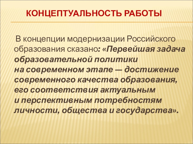 В концепции модернизации Российского образования сказано: «Первейшая задача образовательной политики на современном этапе — достижение современного качества образования, его соответствия актуальным и перспективным потребностям личности, общества и государства».