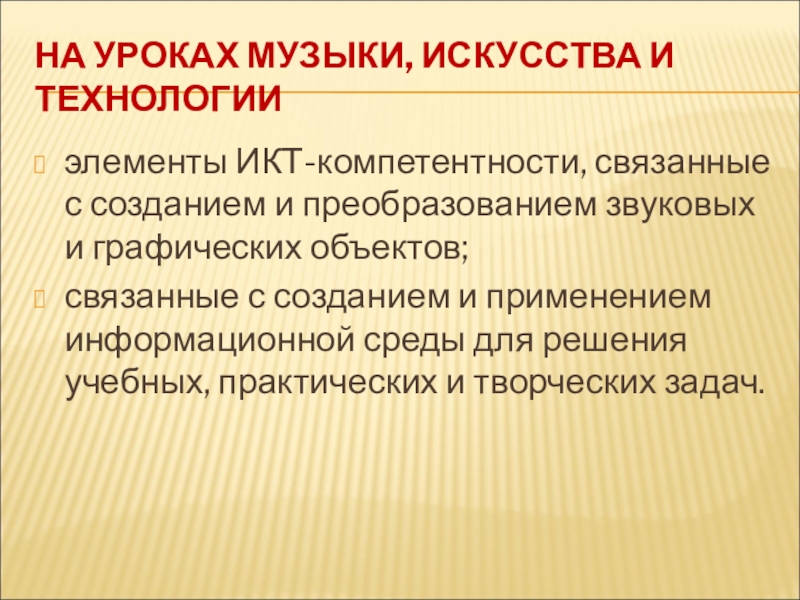 Слайд 24НА УРОКАХ МУЗЫКИ, ИСКУССТВА И ТЕХНОЛОГИИ