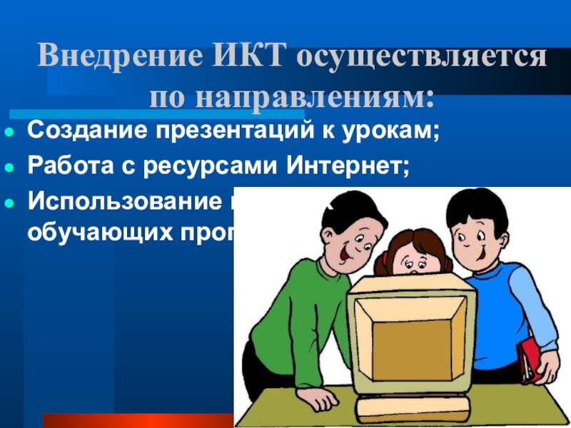 Слайд 7Внедрение ИКТ осуществляется по направлениям: