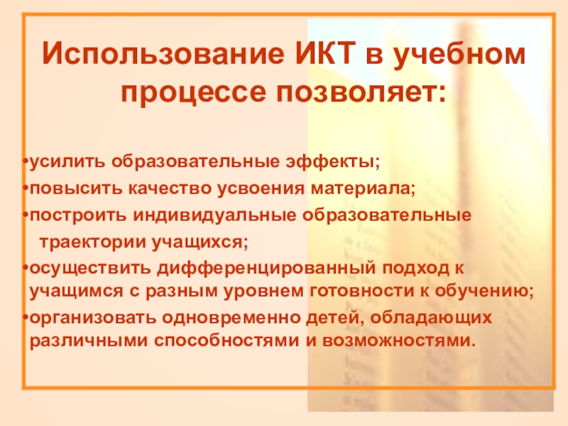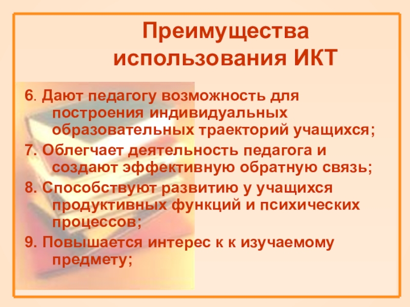 Преимущества использования ИКТ6. Дают педагогу возможность для построения индивидуальных образовательных траекторий учащихся;7. Облегчает деятельность педагога и создают