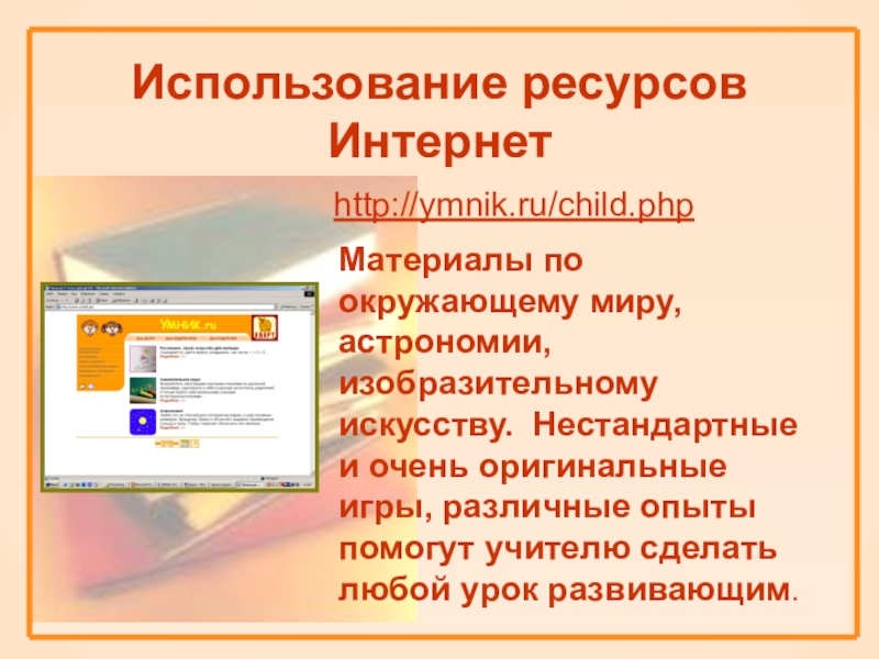 Использование ресурсов Интернет       http://ymnik.ru/child.php Материалы по окружающему миру, астрономии,