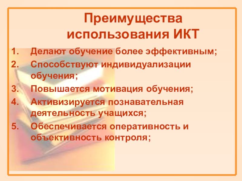 Преимущества использования ИКТДелают обучение более эффективным;Способствуют индивидуализации обучения;Повышается мотивация обучения;Активизируется познавательная деятельность учащихся;Обеспечивается оперативность и объективность контроля;
