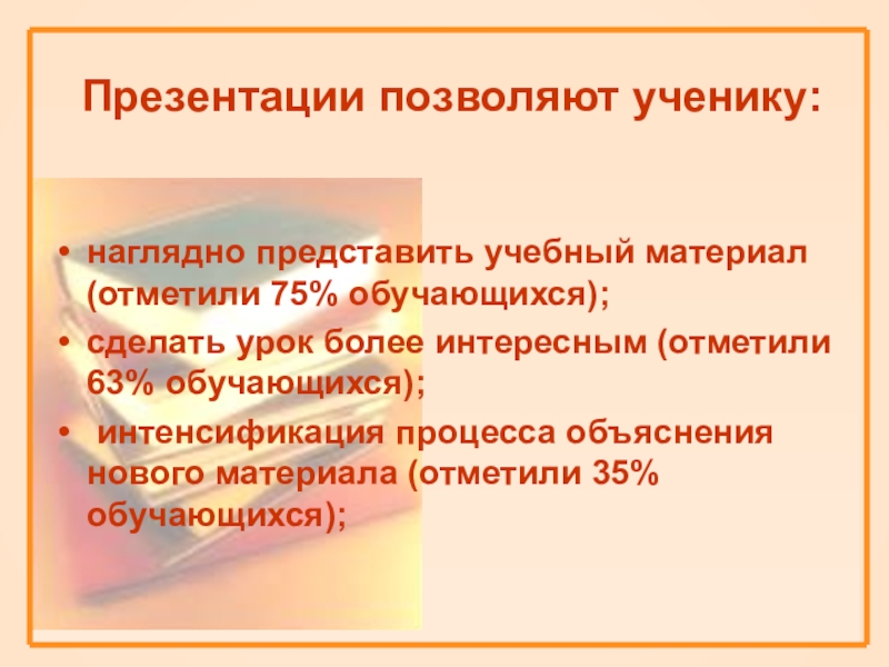 Презентации позволяют ученику:наглядно представить учебный материал (отметили 75% обучающихся);сделать урок более интересным (отметили 63% обучающихся); интенсификация процесса
