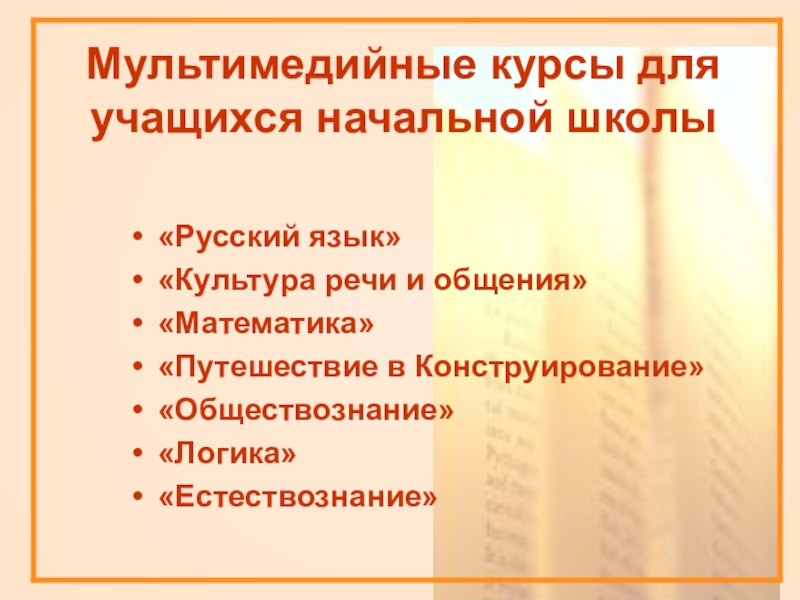Мультимедийные курсы для учащихся начальной школы«Русский язык»«Культура речи и общения»«Математика»«Путешествие в Конструирование»«Обществознание»«Логика»«Естествознание»