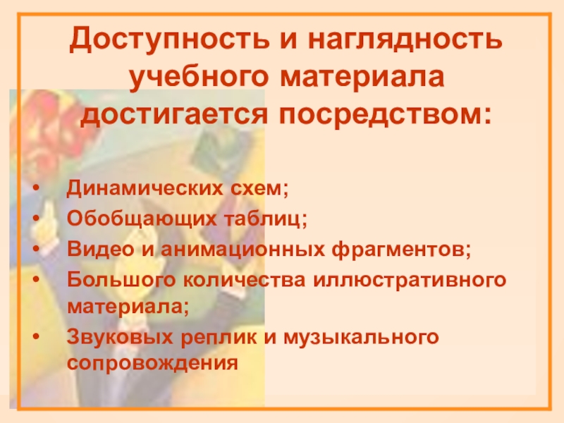 Доступность и наглядность учебного материала достигается посредством:Динамических схем;Обобщающих таблиц;Видео и анимационных фрагментов;Большого количества иллюстративного материала;Звуковых реплик и