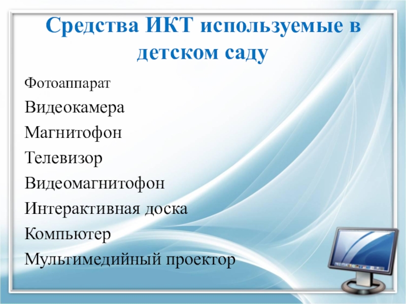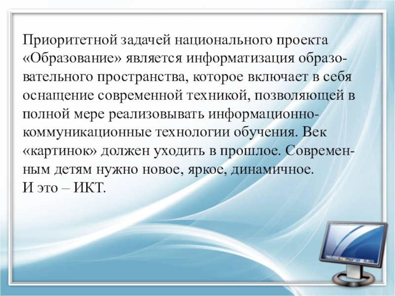 в себя оснащение современной техникой, позволяющей в полной мере реализовывать информационно-коммуникационные технологии обучения. Век «картинок» должен уходить в прошлое. Современ-ным детям нужно новое, яркое, динамичное.