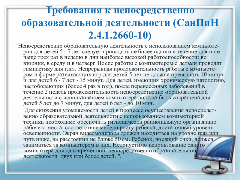Слайд 10Требования к непосредственно образовательной деятельности (СанПиН 2.4.1.2660-10)