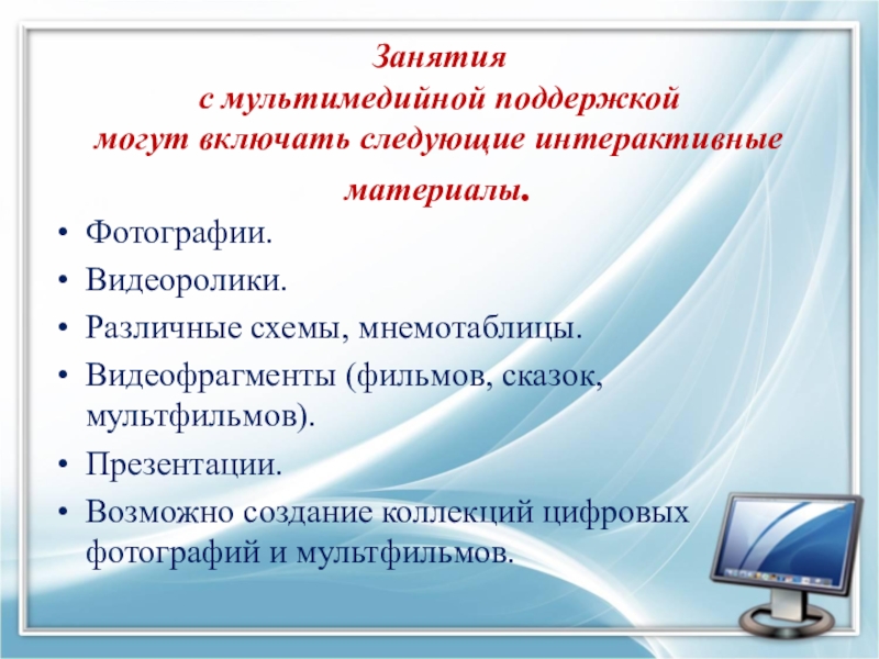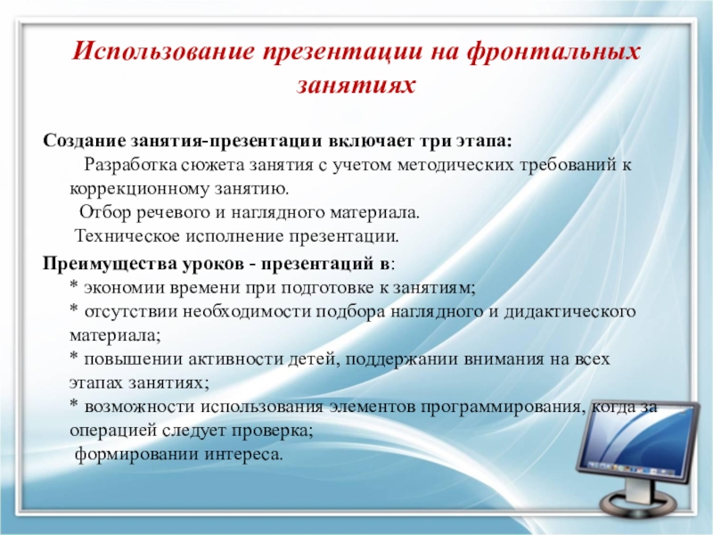 Важно методически правильно проводить занятия, следить, чтобы ребёнок не просто смотрел и слушал, а и сопровождал речью демонстрируемые слайды, свои действия, контролировал правильное произношение и т.д.