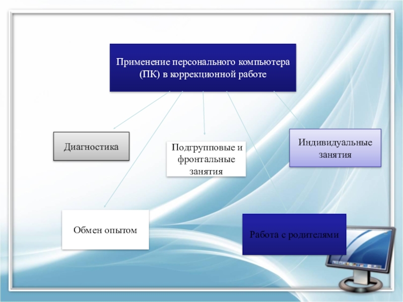Слайд 4Применение персонального компьютера (ПК) в коррекционной работе