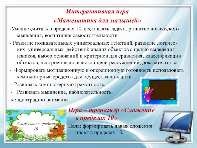 -Умение считать в пределах 10, составлять задачи, развитие логического мышления, воспитание самостоятельности.