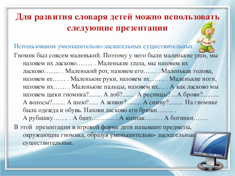 В этой презентации в игровой форме дети называют предметы, окружающие гномика, образуя уменьшительно- ласкательные существительные.