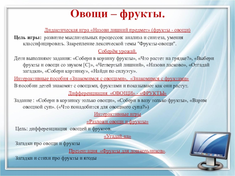 Дидактическая игра «Назови лишний предмет» (фрукты - овощи)
