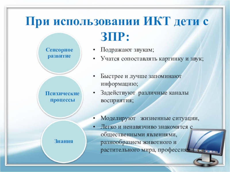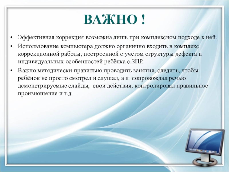 компьютера должно органично входить в комплекс коррекционной работы, построенной с учётом структуры дефекта и индивидуальных особенностей ребёнка с ЗПР.
