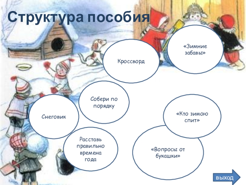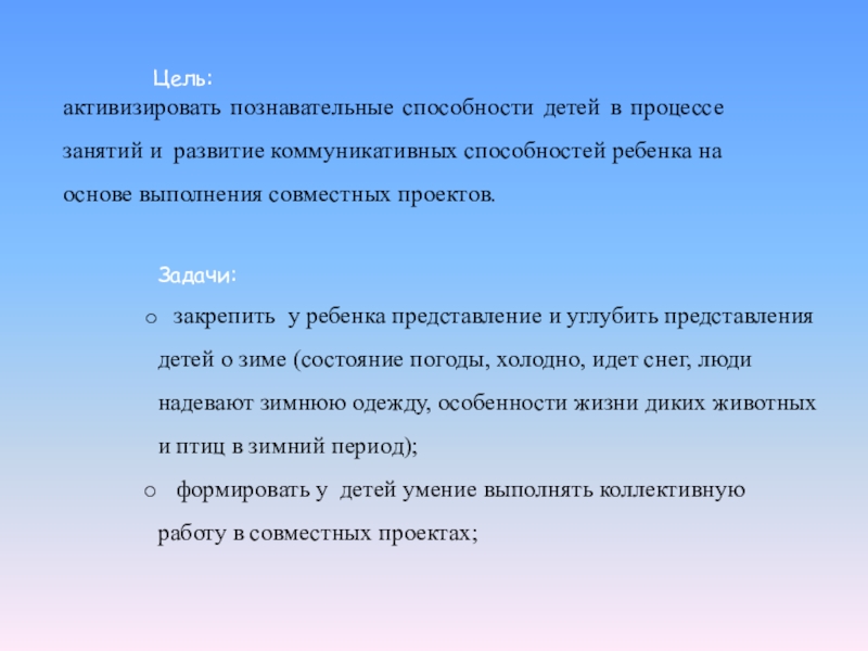 закрепить у ребенка представление и углубить представления детей о зиме (состояние погоды, холодно, идет снег, люди надевают зимнюю одежду, особенности жизни диких животных и птиц в зимний период);