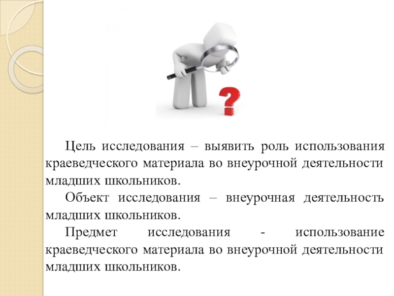 Цель исследования – выявить роль использования краеведческого материала во внеурочной деятельности младших школьников.	Объект исследования – внеурочная деятельность