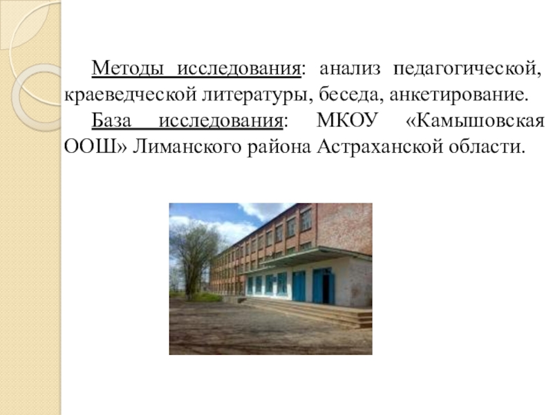 Методы исследования: анализ педагогической, краеведческой литературы, беседа, анкетирование.	База исследования: МКОУ «Камышовская ООШ» Лиманского района Астраханской области.