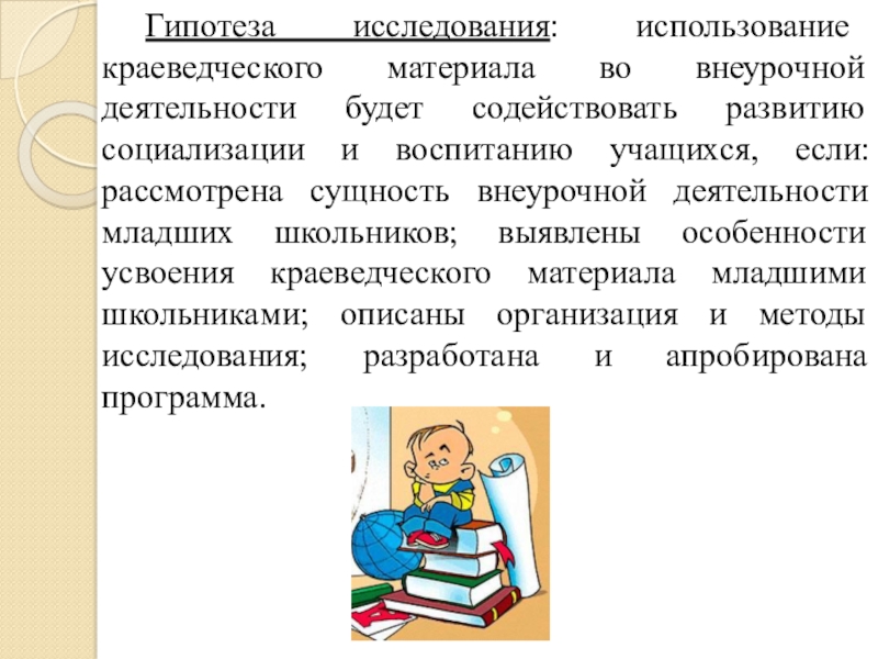 Гипотеза исследования: использование краеведческого материала во внеурочной деятельности будет содействовать развитию социализации и воспитанию учащихся, если: рассмотрена