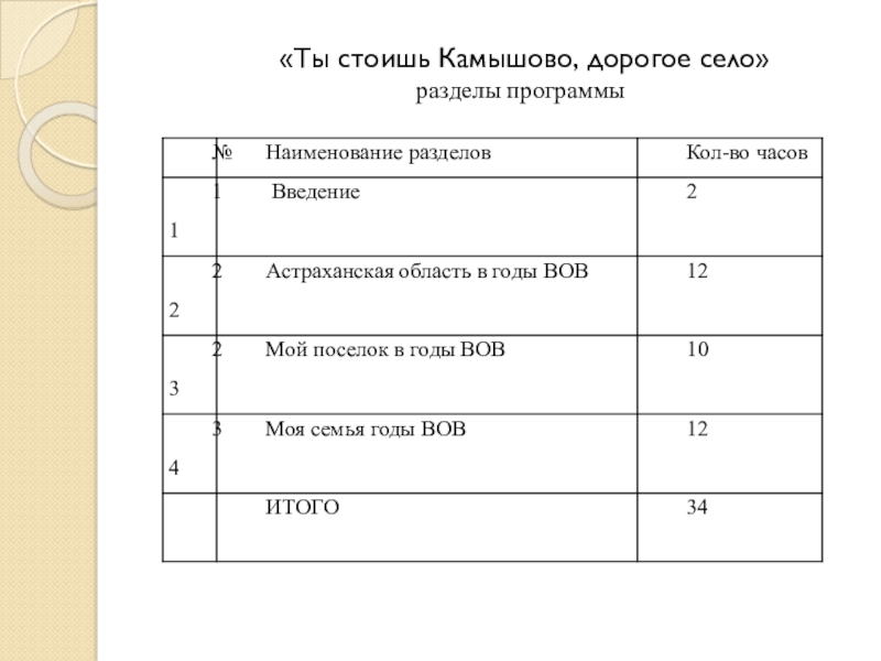 «Ты стоишь Камышово, дорогое село»разделы программы