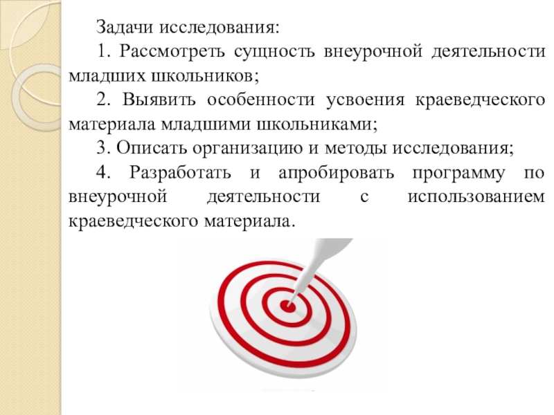 Задачи исследования:	1. Рассмотреть сущность внеурочной деятельности младших школьников;	2. Выявить особенности усвоения краеведческого материала младшими школьниками;	3. Описать организацию