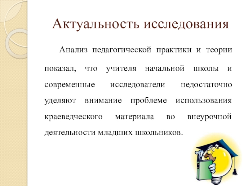 Актуальность исследования		Анализ педагогической практики и теории показал, что учителя начальной школы и современные исследователи недостаточно уделяют внимание