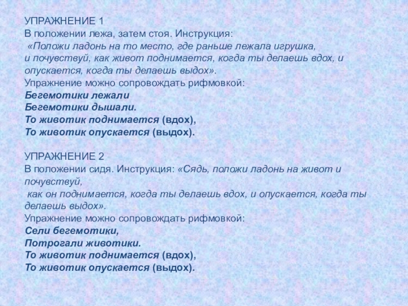 5. Не нужно делать все упражнения. Достаточно выбрать несколько, включающих разные элементы: с произнесением звуков на выдохе и без, с поднятием рук и без, с надутием животика и без. Каждое упражнение можно повторять до 5 раз.