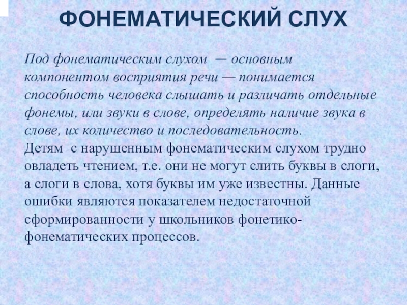 Под фонематическим слухом — основным компонентом восприятия речи — понимается
