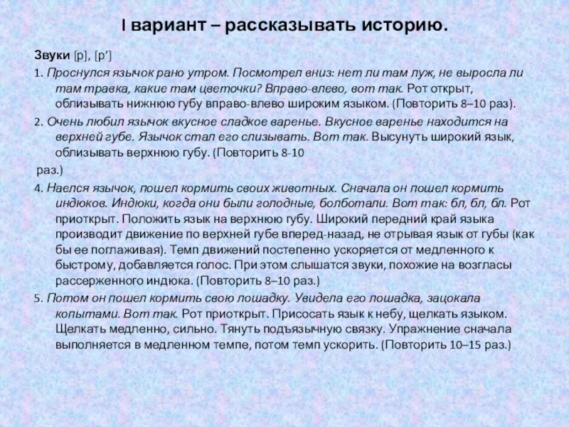 нет ли там луж, не выросла ли там травка, какие там цветочки? Вправо-влево, вот так. Рот открыт, облизывать нижнюю губу вправо-влево широким языком. (Повторить 8–10 раз).