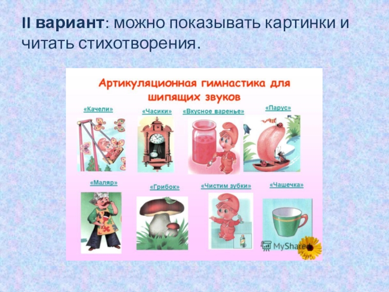 Слайд 10II вариант: можно показывать картинки и читать стихотворения.