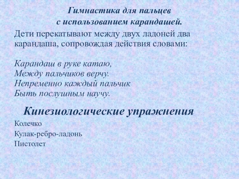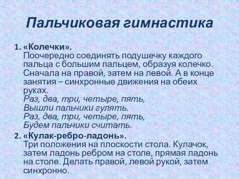 колечко. Сначала на правой, затем на левой. А в конце занятия – синхронные движения на обеих руках.