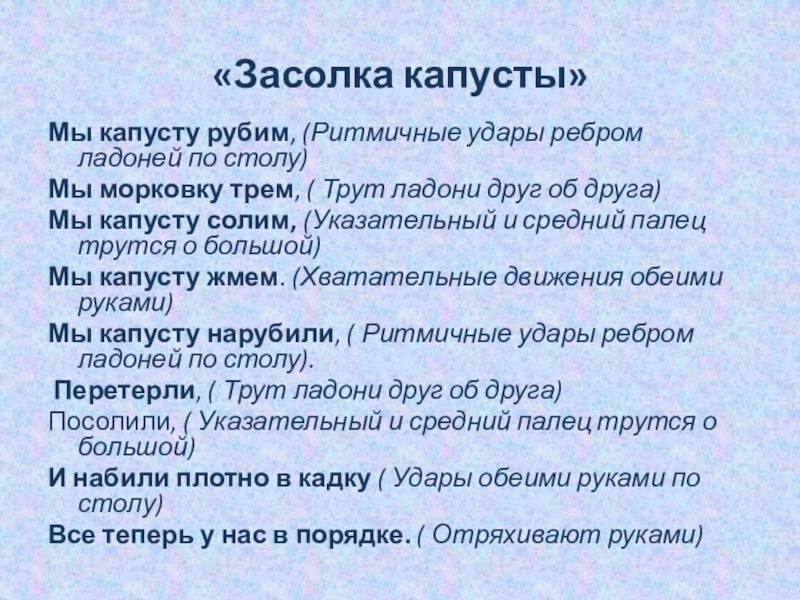 Мы капусту солим, (Указательный и средний палец трутся о большой)