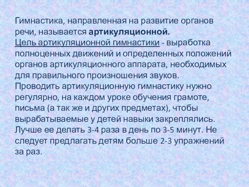 Слайд 7Гимнастика, направленная на развитие органов речи, называется артикуляционной.