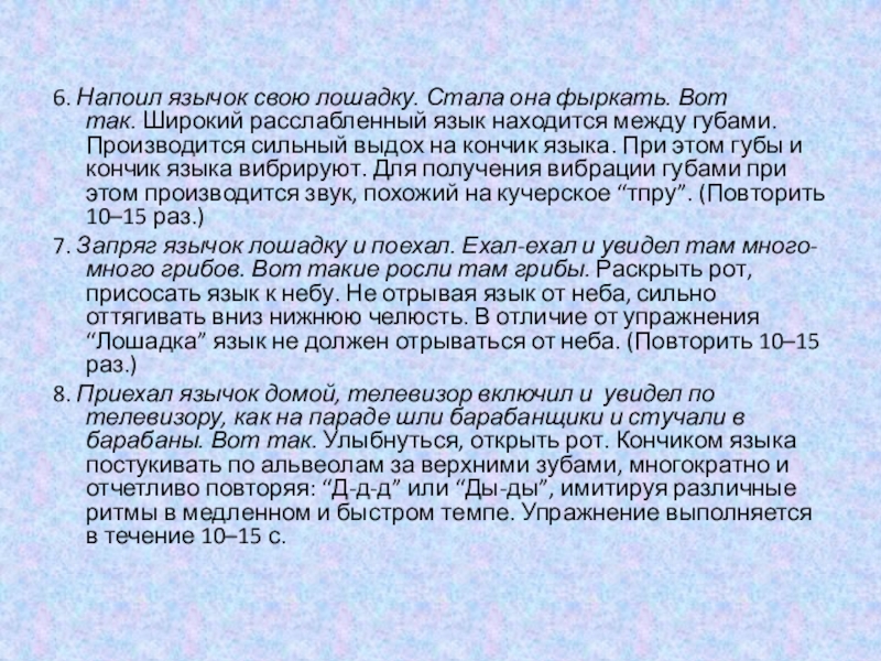 5. Потом он пошел кормить свою лошадку. Увидела его лошадка, зацокала копытами. Вот так. Рот приоткрыт. Присосать язык к небу, щелкать языком. Щелкать медленно, сильно. Тянуть подъязычную связку. Упражнение сначала выполняется в медленном темпе, потом темп ускорить. (Повторить 10–15 раз.)