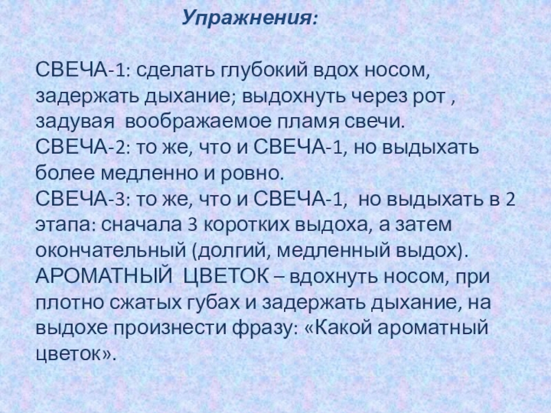 АРОМАТНЫЙ ЦВЕТОК – вдохнуть носом, при плотно сжатых губах и задержать дыхание, на выдохе произнести фразу: «Какой ароматный цветок».