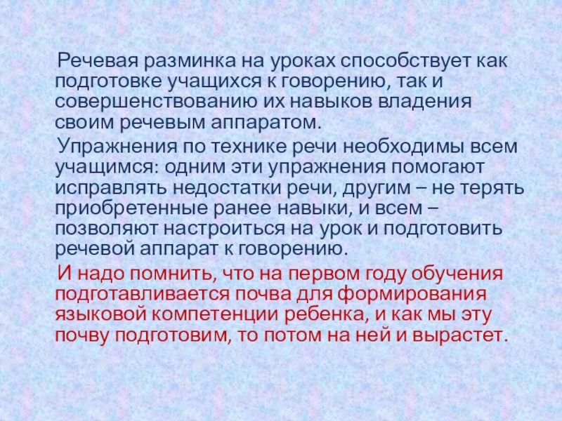 Слайд 17 Речевая разминка на уроках способствует как подготовке учащихся