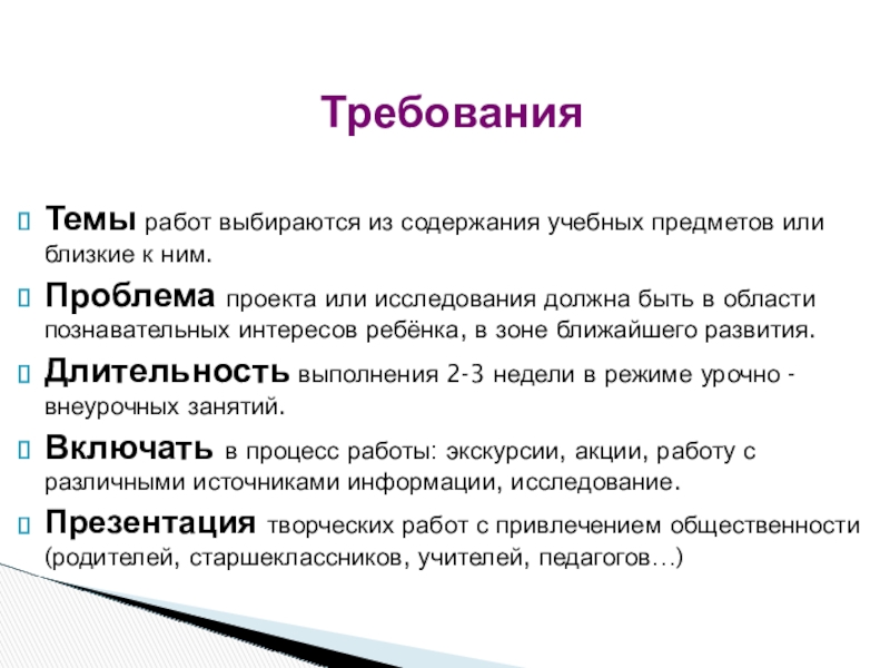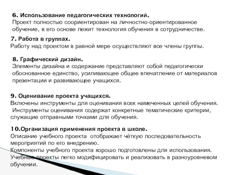 Должно быть понятно, представлено логично и удобно для восприятия. Самостоятельные исследования учащихся иллюстрируются. Цели и тема ясно изложены, хорошо определены и поддержаны вопросами темы и учебной программы. Учебный проект поддерживает разноуровневое обучение.