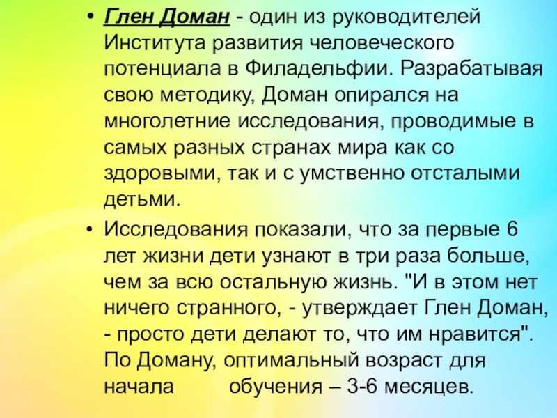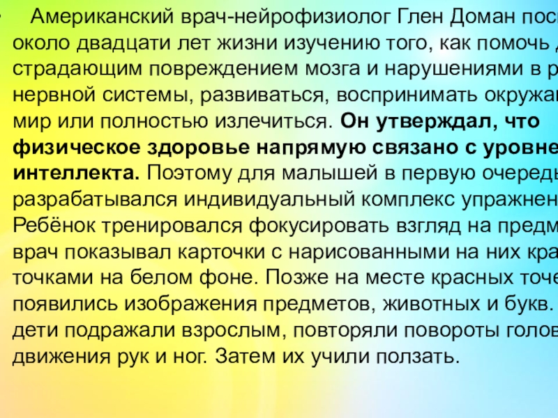 Слайд 4 Американский врач-нейрофизиолог Глен Доман посвятил около двадцати лет жизни