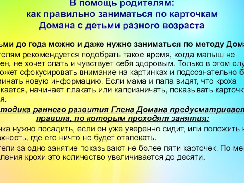 Методика раннего развития Глена Домана предусматривает правила, по которым проходят занятия: