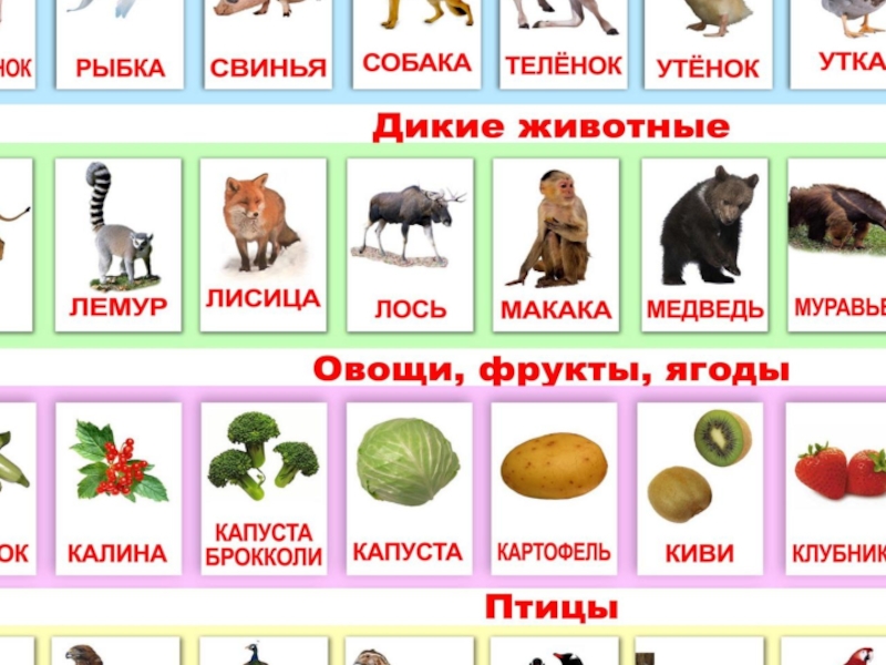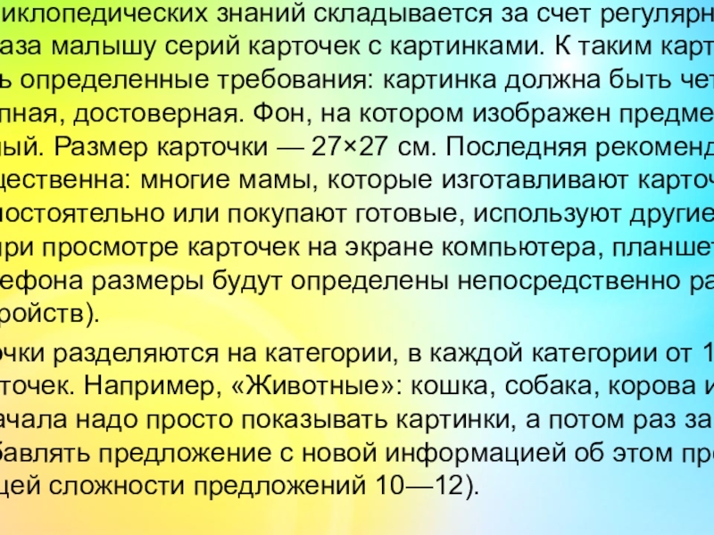 малышу серий карточек с картинками. К таким карточкам есть определенные требования: картинка должна быть четкая, крупная, достоверная. Фон, на котором изображен предмет, — белый. Размер карточки — 27×27 см. Последняя рекомендация не существенна: многие мамы, которые изготавливают карточки самостоятельно или покупают готовые, используют другие размеры (а при просмотре карточек на экране компьютера, планшета или телефона размеры будут определены непосредственно размерами устройств).