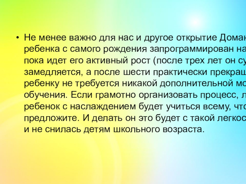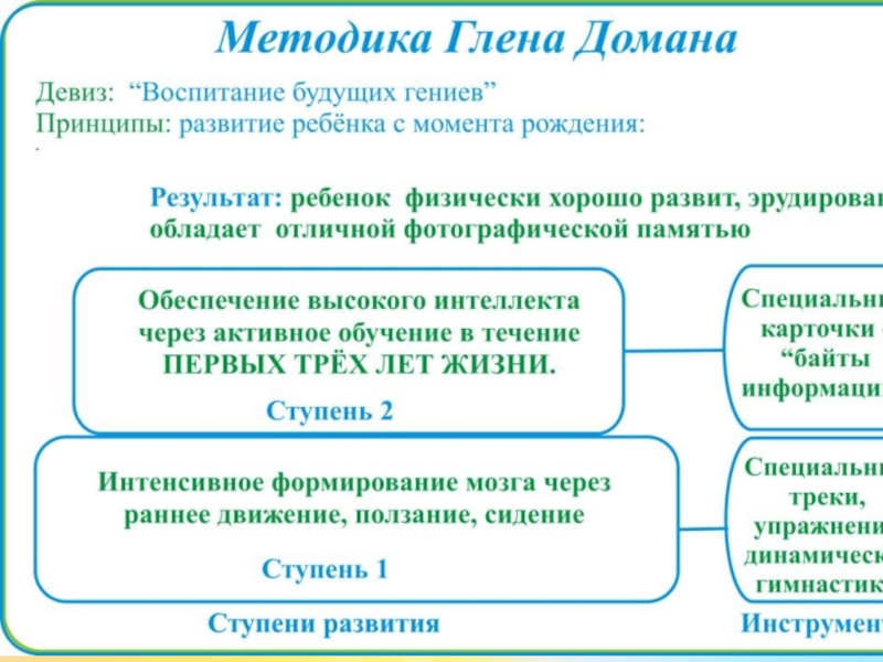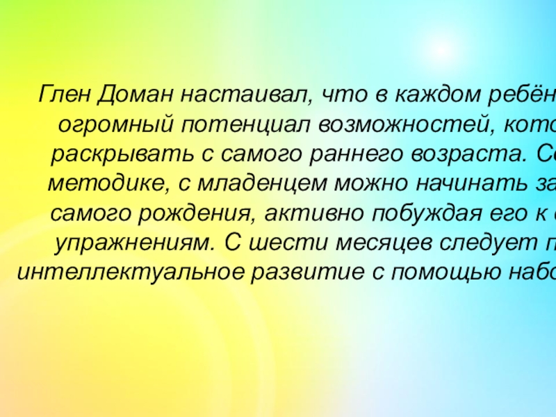 потенциал возможностей, которые нужно раскрывать с самого раннего возраста. Согласно его методике, с младенцем можно начинать заниматься с самого рождения, активно побуждая его к физическим упражнениям. С шести месяцев следует подключать интеллектуальное развитие с помощью наборов карточек.