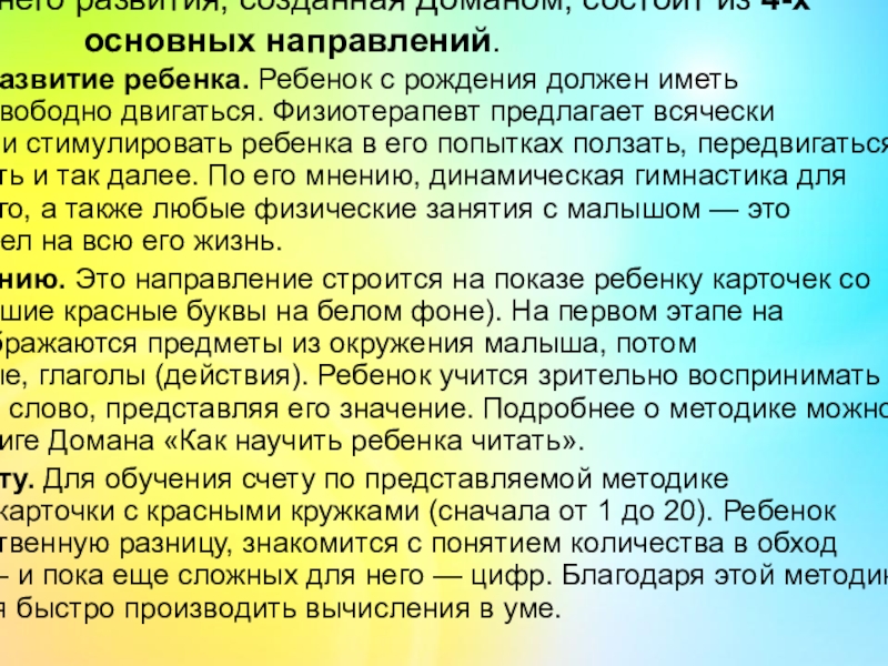 Слайд 8Методика раннего развития, созданная Доманом, состоит из 4-х основных направлений.