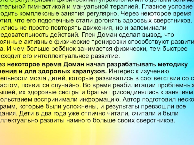 гимнастикой и мануальной терапией. Главное условие — проводить комплексные занятия регулярно. Через некоторое время врач заметил, что его подопечные стали догонять здоровых сверстников. Они научились не просто повторять движения, но и запоминали последовательность действий. Глен Доман сделал вывод, что постоянные активные физические тренировки способствуют развитию мозга. И чем больше ребёнок занимается физически, тем быстрее происходит его интеллектуальное развитие.