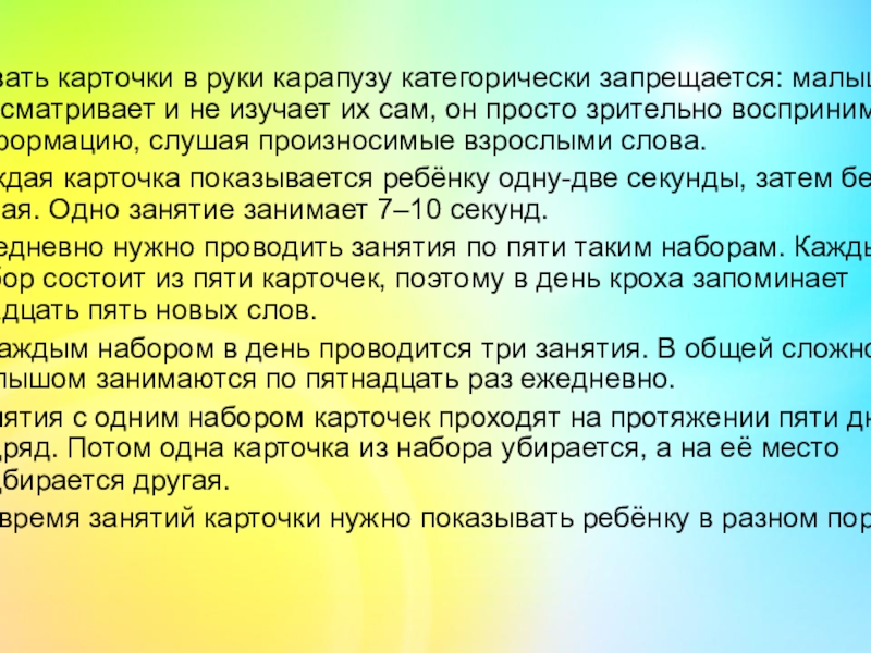 Каждая карточка показывается ребёнку одну-две секунды, затем берётся новая. Одно занятие занимает 7–10 секунд.
