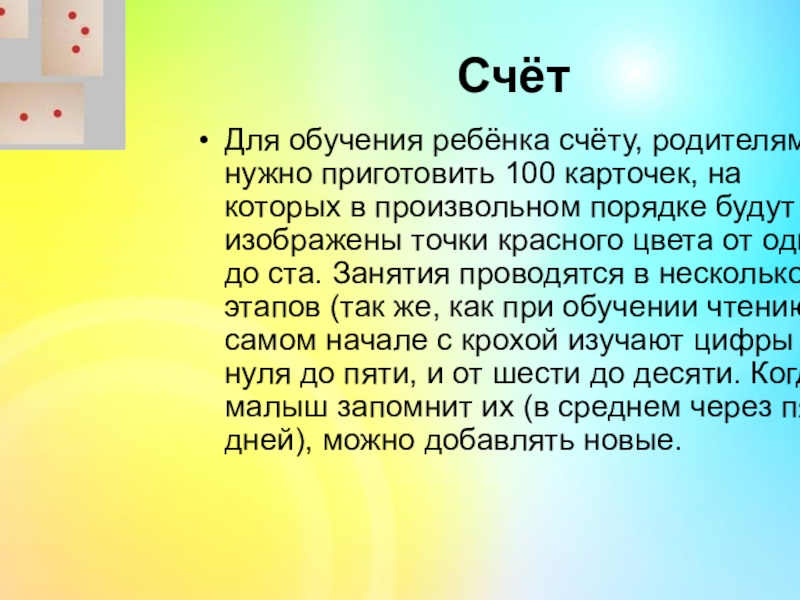 в произвольном порядке будут изображены точки красного цвета от одного до ста. Занятия проводятся в несколько этапов (так же, как при обучении чтению). В самом начале с крохой изучают цифры от нуля до пяти, и от шести до десяти. Когда малыш запомнит их (в среднем через пять дней), можно добавлять новые.