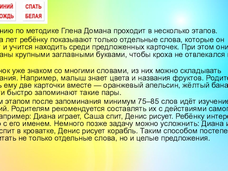 Обучение чтению по методике Глена Домана проходит в несколько этапов.